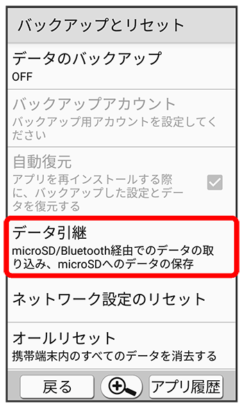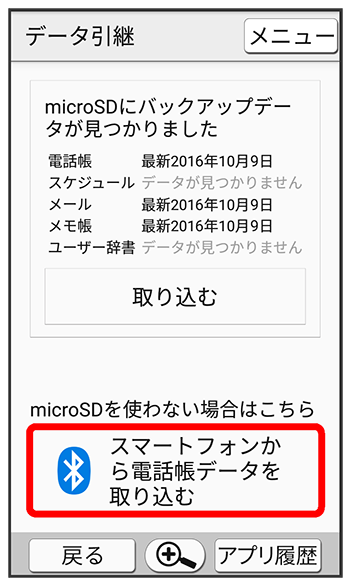 - SDカードが挿入されていないときや、SDカードにバックアップデータがないときは、取り込み元の携帯電話の選択画面が表示されます。画面に従って操作してください。