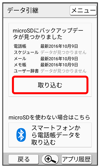 - SDカードが挿入されていないときや、SDカードにバックアップデータがないときは、取り込み元の端末の選択画面が表示されます。画面に従って操作してください。