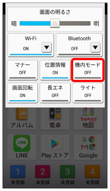 また、を設定したあとにWi-Fi機能やBluetooth®機能を有効にすると、機内モード設定中でもWi-Fi接続やBluetooth®通信を行うことができます。通信が許可されている場所であるか確認のうえ、操作してください。