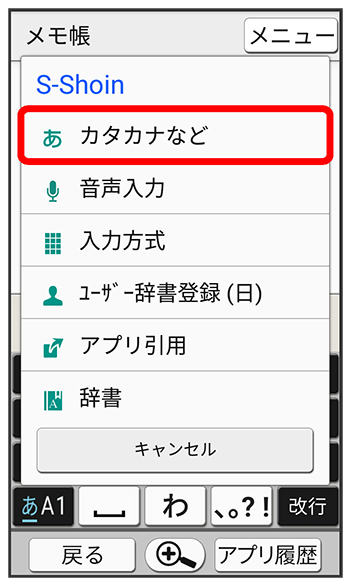 - 全角カタカナ入力モードでの入力例です。ひらがな入力モードの変換候補からも入力できます。