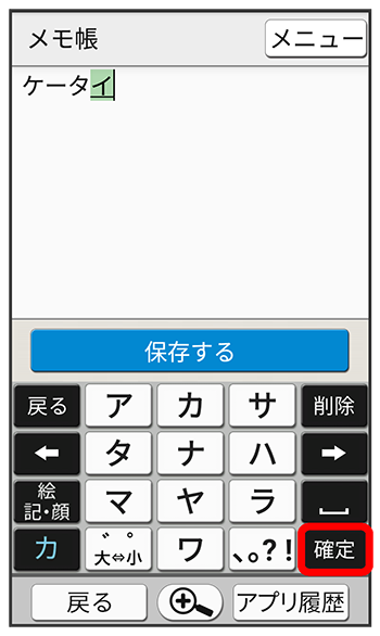 - キーをくり返しタップせず、キーを長く押したときに表示されるキー入力ガイドを利用して文字を入力することもできます。詳しくは「フリック入力(ドラッグ入力)について」を参照してください。