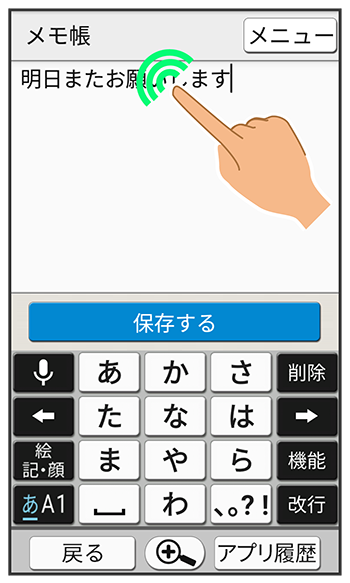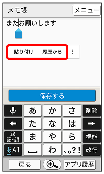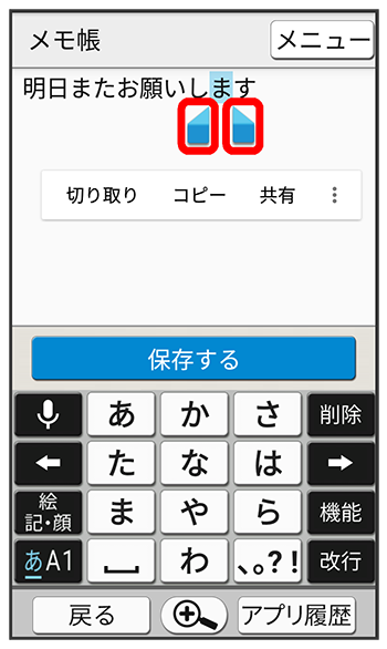 をドラッグすると、貼り付ける位置を調整できます。- を選択したときは、貼り付ける文字列をタップします。