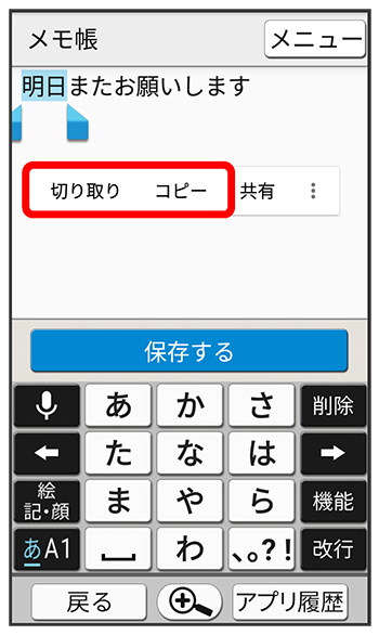 文字入力画面で入力済みの文字列をロングタッチ共有方法をタップ画面に従って操作