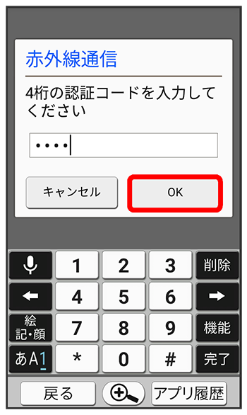 - 認証コードは、正しい通信相手かどうかをお互いに確認するための暗証番号です。送信側/受信側で同じ数字(4桁)を入力します。特に決まった数字ではなく、その通信限りのものです。