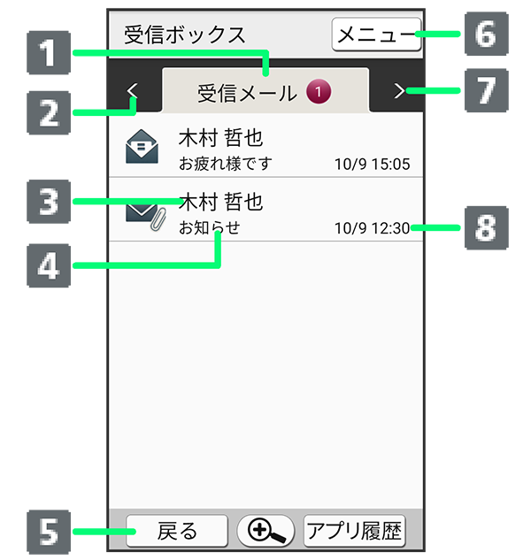メール一覧画面(受信ボックス/送信ボックス)で並べ替え方法をタップメールを別のフォルダに移動する