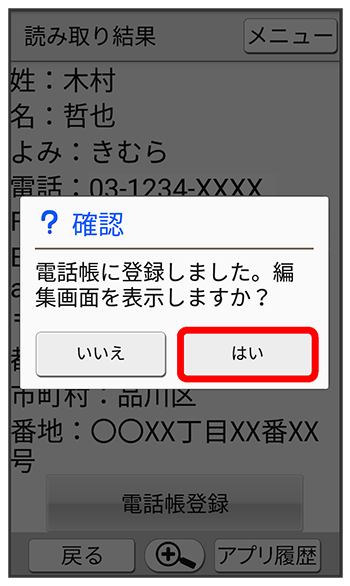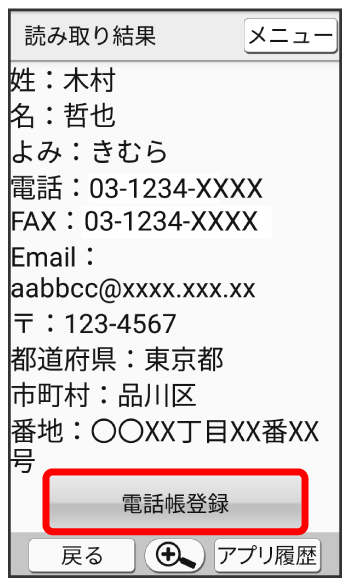 読み取った情報が入力された電話帳編集画面が表示されます。