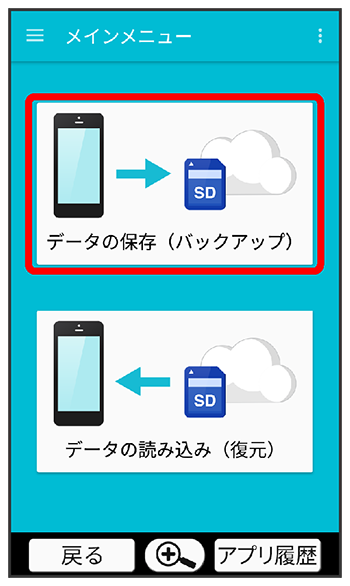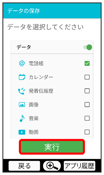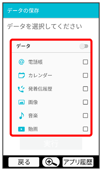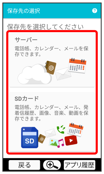 本体の電話帳データ/カレンダーデータ/発着信履歴データ/画像データ/音楽データ/動画データ/メールデータを、サーバー/SDカードに保存します。