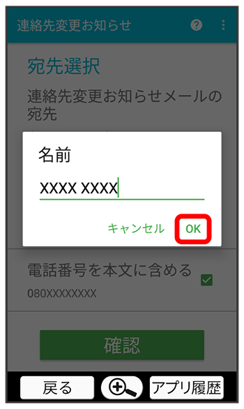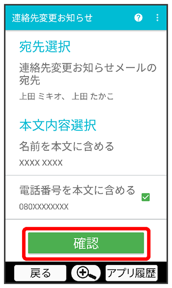 - /をタップすると、本文に電話番号/Gmailアドレスを記載するかどうかを設定できます。タップするたびに、有効(