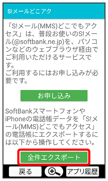 「S!メール(MMS)どこでもアクセス」へ電話帳をエクスポートする
