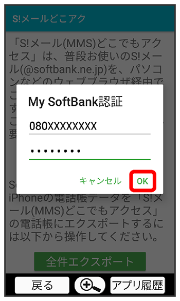 - 初めてエクスポートするときは、が表示されます。「S!メール(MMS)どこでもアクセス」にお申し込みが必要なときは、をタップし、画面の指示に従って操作してください。