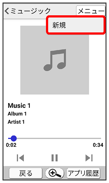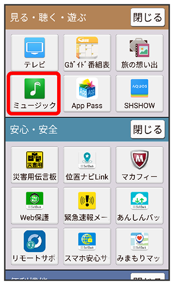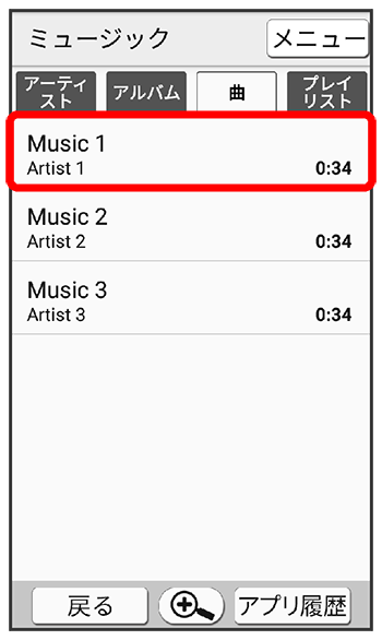- 以前にミュージックを起動していたときは、終了時のカテゴリのミュージック画面が表示されます。