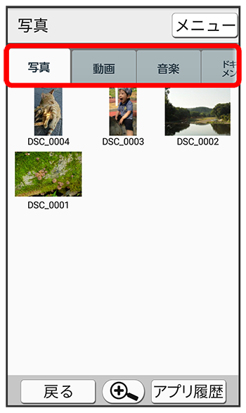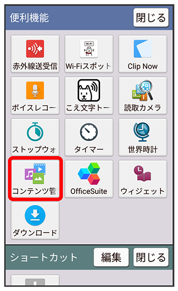 コンテンツ管理画面で、データの種類をタップ削除するデータをタップ(内部ストレージとSDカード、USBメモリの間でデータをやりとりする