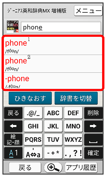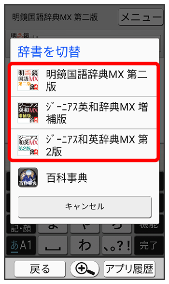 - をタップすると、別の単語を検索できます。このあと、語句を入力して調べ直してください。