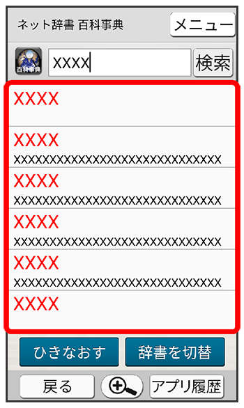 - をタップすると、別の単語を検索できます。このあと、語句を入力して調べ直してください。