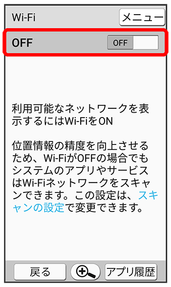 - 「Wi-Fi」を無効にするときは、をタップします(表示)。