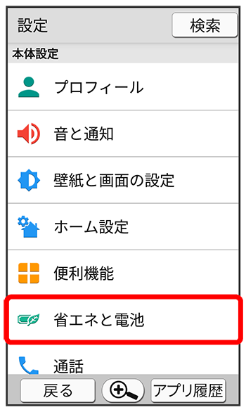 省エネと電池画面で項目をタップ電池使用状況の詳細画面が表示されます。