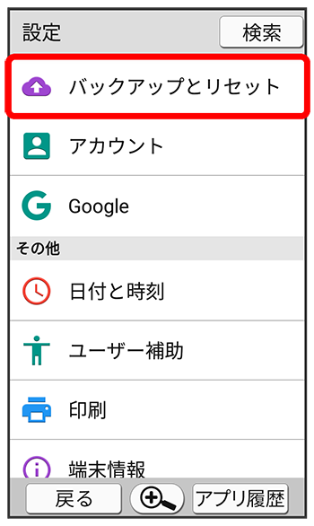 バックアップとリセット画面で/- をタップするとに、をタップするとに切り替わります。