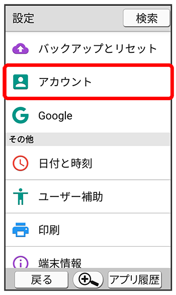 (設定)アカウントの種類をタップアカウントをタップ同期するアプリケーションやデータをタップ