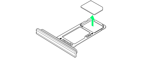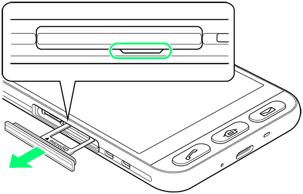 - ディスプレイを上にして、カードトレイを引き出してください。ディスプレイを下にしたり、本機を立てた状態でカードトレイを引き出すと、SIMカードやSDカードがカードトレイから外れ、紛失する可能性があります。