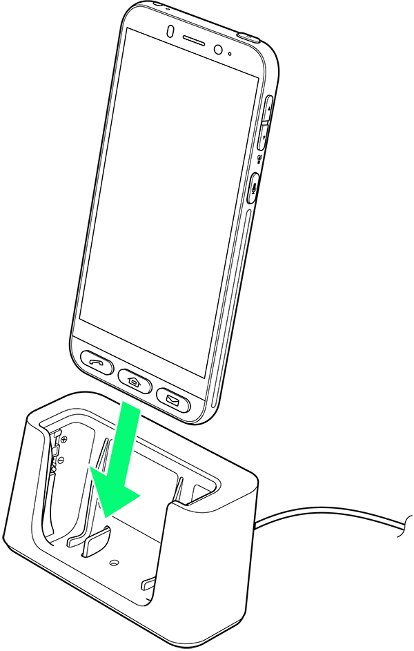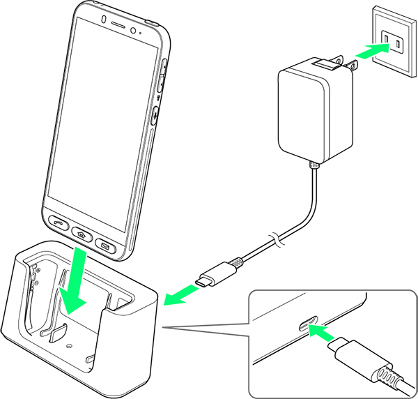付属の卓上ホルダー[SHEGT1]と、オプション品のACアダプタ(USB Type-C Quick ChargeTM 3.0対応)[ZSCAZX]1を使用して充電します。