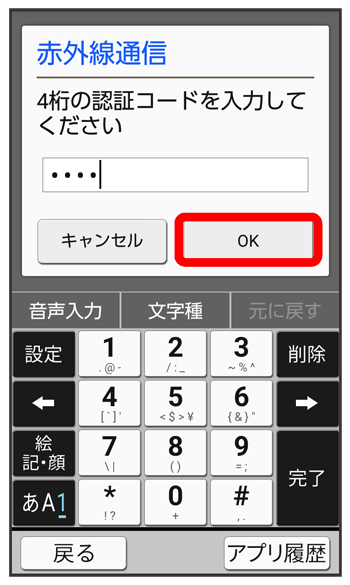 - 認証コードは、正しい通信相手かどうかをお互いに確認するための暗証番号です。送信側/受信側で同じ数字(4桁)を入力します。特に決まった数字ではなく、その通信限りのものです。