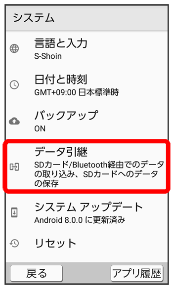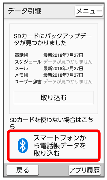 - SDカードが挿入されていないときや、SDカードにバックアップデータがないときは、取り込み元の携帯電話の選択画面が表示されます。画面に従って操作してください。