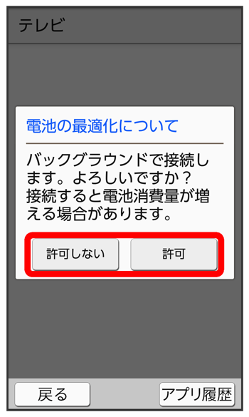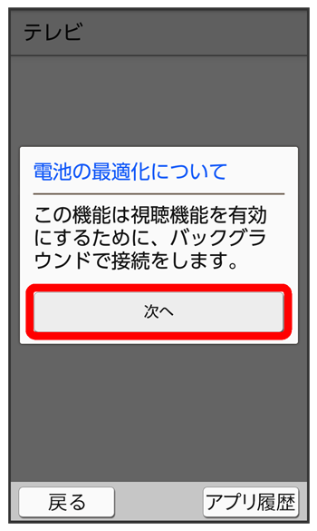 (テレビ)をはじめて起動したときの操作を例に説明します。 - 電池の最適化を行った場合、画面消灯中(充電中を除く)はアプリが動作しません。アプリ/機能が利用できないなど、意図しない現象が発生することがあります。