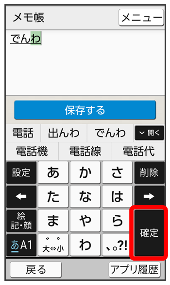 をタップしたあと、次の文字を入力します。 - キーをくり返しタップせず、キーをロングタッチしたときに表示されるキー入力ガイドを利用して文字を入力することもできます。詳しくは「フリック入力について」を参照してください。