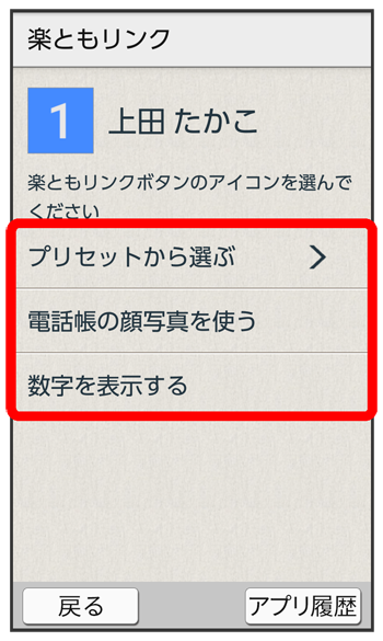 の各ボタンに登録します。登録後は、ボタンの下に登録した相手の名前が表示されるようになります。