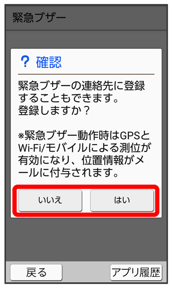 - をタップしたときは、このあと緊急ブザー連絡先の登録先(/)をタップします。