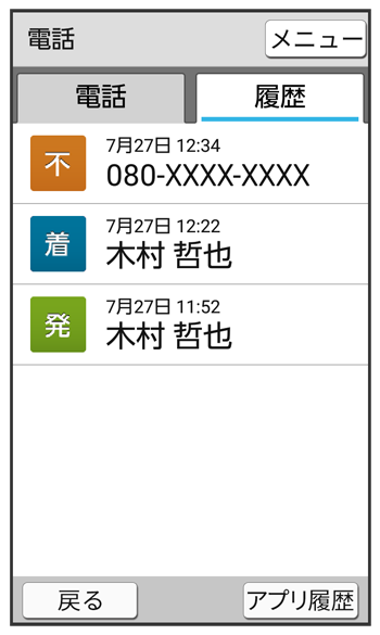 発着信履歴一覧画面で削除する相手をタップ(発着信履歴をすべて削除する