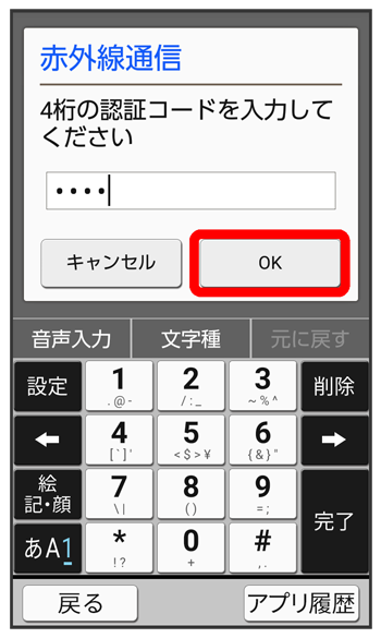 - 認証コードは、正しい通信相手かどうかをお互いに確認するための暗証番号です。送信側/受信側で同じ数字(4桁)を入力します。特に決まった数字ではなく、その通信限りのものです。