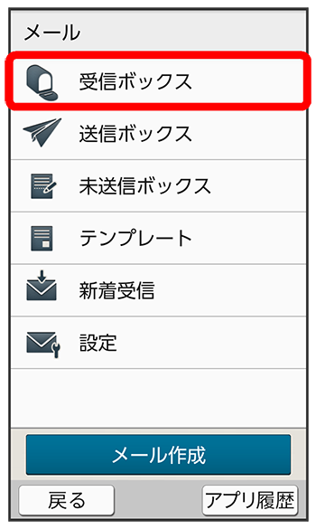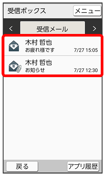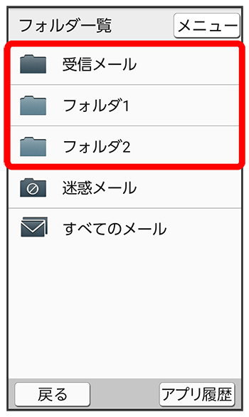 - 通常、受信メールは「受信メール」に保存されています。別のフォルダ(「フォルダ1」など)に振り分けた(移動した)メールを確認するときは、それぞれのフォルダをタップしてください。