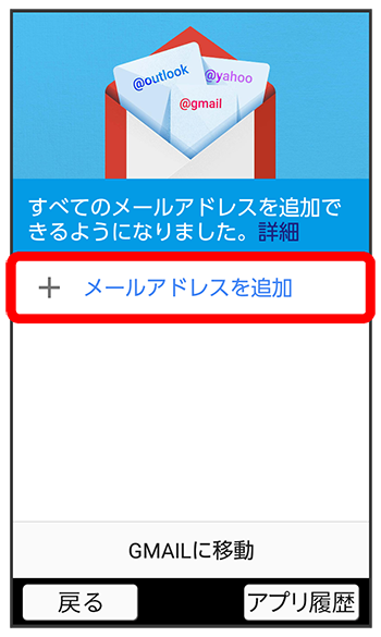 (Gmail)を起動すると、アカウント設定画面が表示され、設定操作を行うことができます。