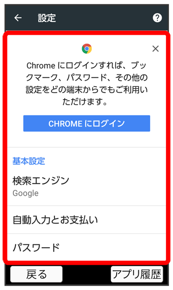 | CHROMEにログイン | Google アカウントでログインして、タブやブックマーク、履歴などの設定を利用できます。ログインすると、アカウント情報が表示されます。 |