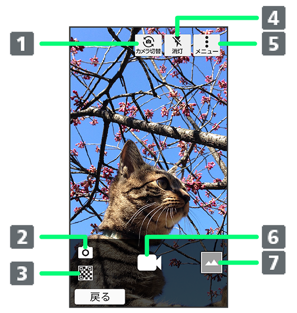 インカメラ/アウトカメラを切り替えます。 - 写真撮影切替