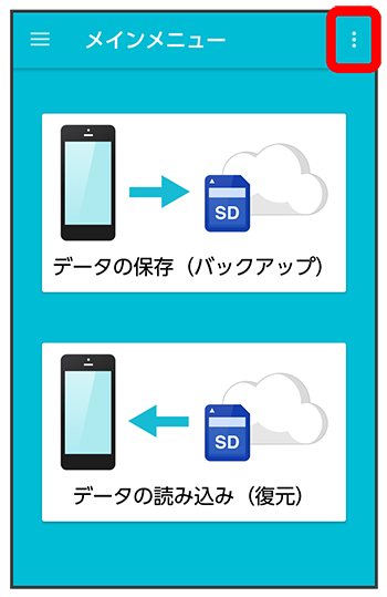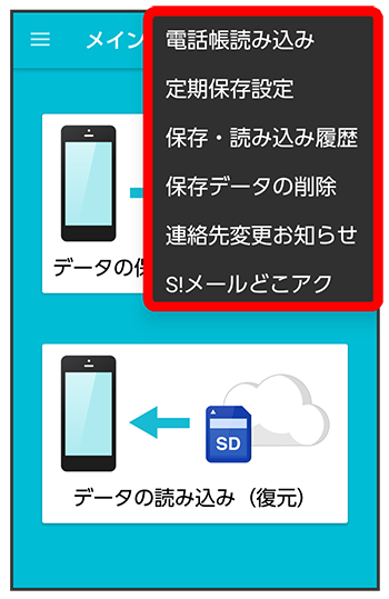 | 定期保存設定 | 本体の電話帳、カレンダー、発着信履歴、画像、音楽、動画のデータを、サーバー/SDカードに定期的に自動で保存します。詳しくは、「定期的に自動で保存する」を参照してください。 |