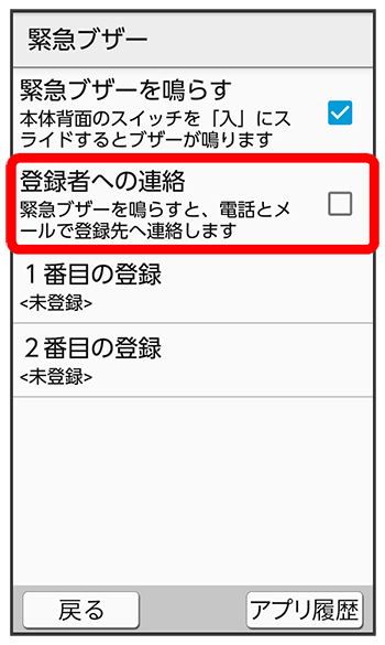 緊急ブザー画面で/緊急連絡先への連絡を行わないようにする