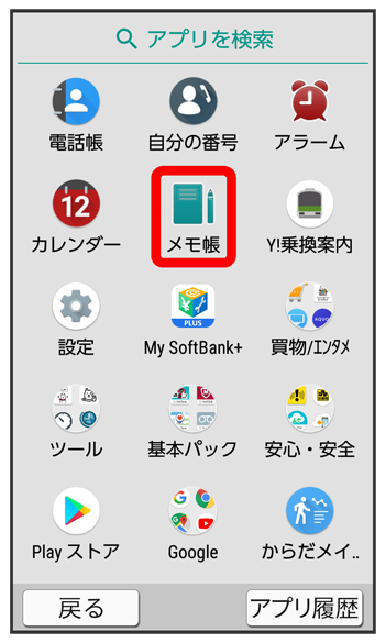 メモ帳一覧画面でメモをタップ(選択したアプリが起動します。