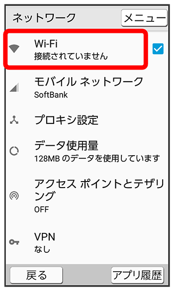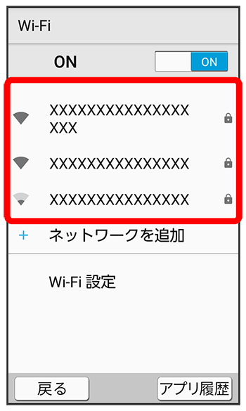 Wi-Fi画面で画面に従って操作- 「Wi-Fi」がONのときに設定できます。