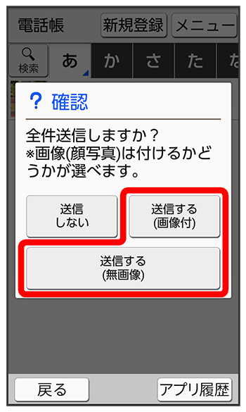送信する電話帳のアカウントをタップ認証コードを入力- 認証コードは、正しい通信相手かどうかをお互いに確認するための暗証番号です。送信側/受信側で同じ数字(4桁)を入力します(特に決まった数字はなく、その通信限りのものです)。