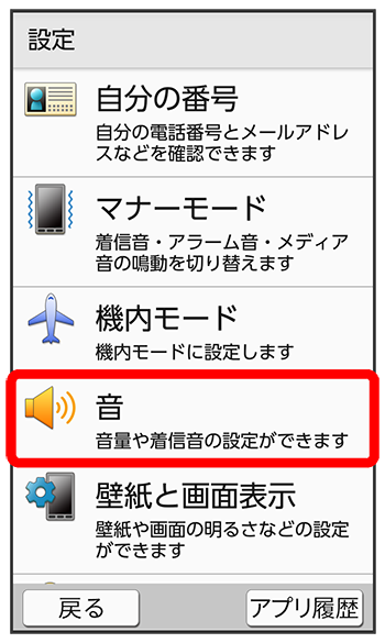 | 詳細設定 | デフォルトの通知音やデフォルトのアラーム音、マナーモード、その他の音やバイブレーションなどについて設定します。 緊急速報メールの設定について詳しくは、「緊急速報メールを利用する」を参照してください。 |