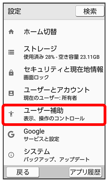 | 拡大 | トリプルタップやユーザー補助機能ボタンを使うことで画面を拡大するかどうかを設定します。 |