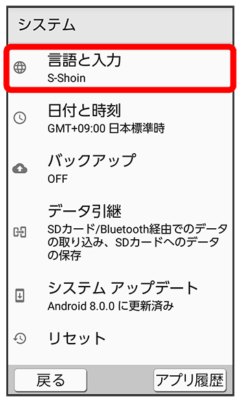 言語と入力画面で入力方法をタップ画面に従って操作- 入力方法を追加/解除するときは、をタップしたあと、画面に従って操作してください。