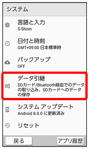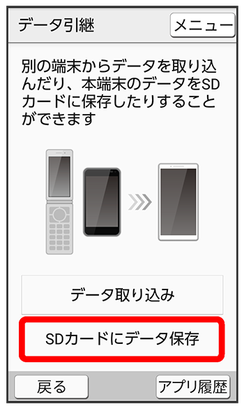 本機の電話帳、メール、スケジュール、メモ帳、ユーザー辞書/学習辞書をSDカードに保存することができます。