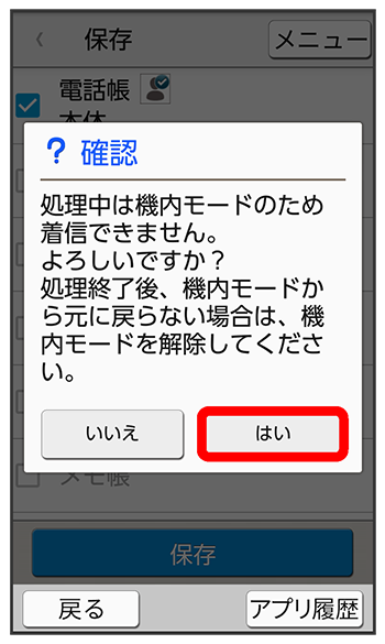 内部ストレージの空き容量が11MB未満のときは保存できません。また、電池残量が不足しているときは、操作が中止されます。電池残量が十分あるときに操作することをおすすめします。