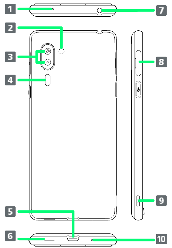 | 送話口/マイク | 自分の声を通話相手に伝えます。動画撮影時はマイクとして利用します。 利用時は送話口/マイクをふさがないようご注意ください。 |