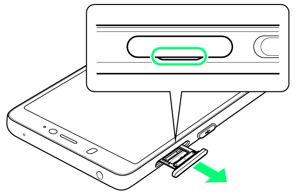 - ディスプレイを上にして、カードトレイを引き出してください。ディスプレイを下にしたり、本機を立てた状態でカードトレイを引き出すと、SIMカードやSDカードがカードトレイから外れ、紛失する可能性があります。