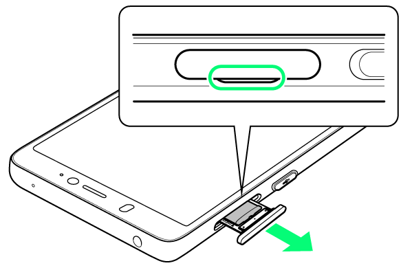 - ディスプレイを上にして、カードトレイを引き出してください。ディスプレイを下にしたり、本機を立てた状態でカードトレイを引き出すと、SIMカードやSDカードがカードトレイから外れ、紛失する可能性があります。