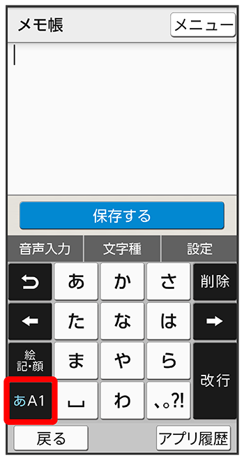 をタップするたびに、「半角英字入力」→「半角数字入力」→「ひらがな漢字入力」の順に切り替わります。